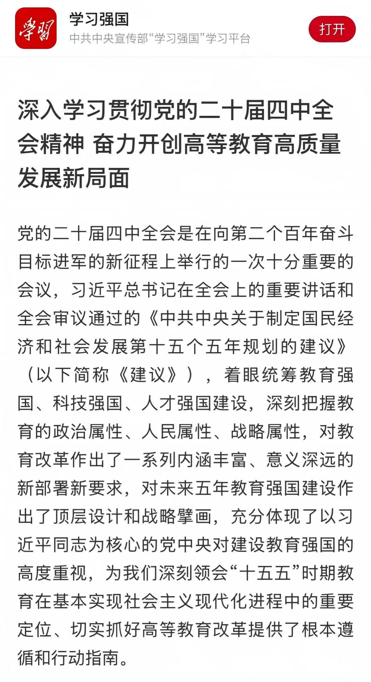 深入学习贯彻党的二十届四中全会精神,是当前和今后一个时期全党全国的一项重大政治任务,作为高等学校,在全面系统学习全会精神的同时,尤其要重点学习习近平总书记在全会上的重要讲话、全会公报和《建议》中有关教育的重要论述。这些论述深刻阐明了教育在强国建设中的基础性、战略性支撑作用,为高等教育改革发展指明了前进方向。
