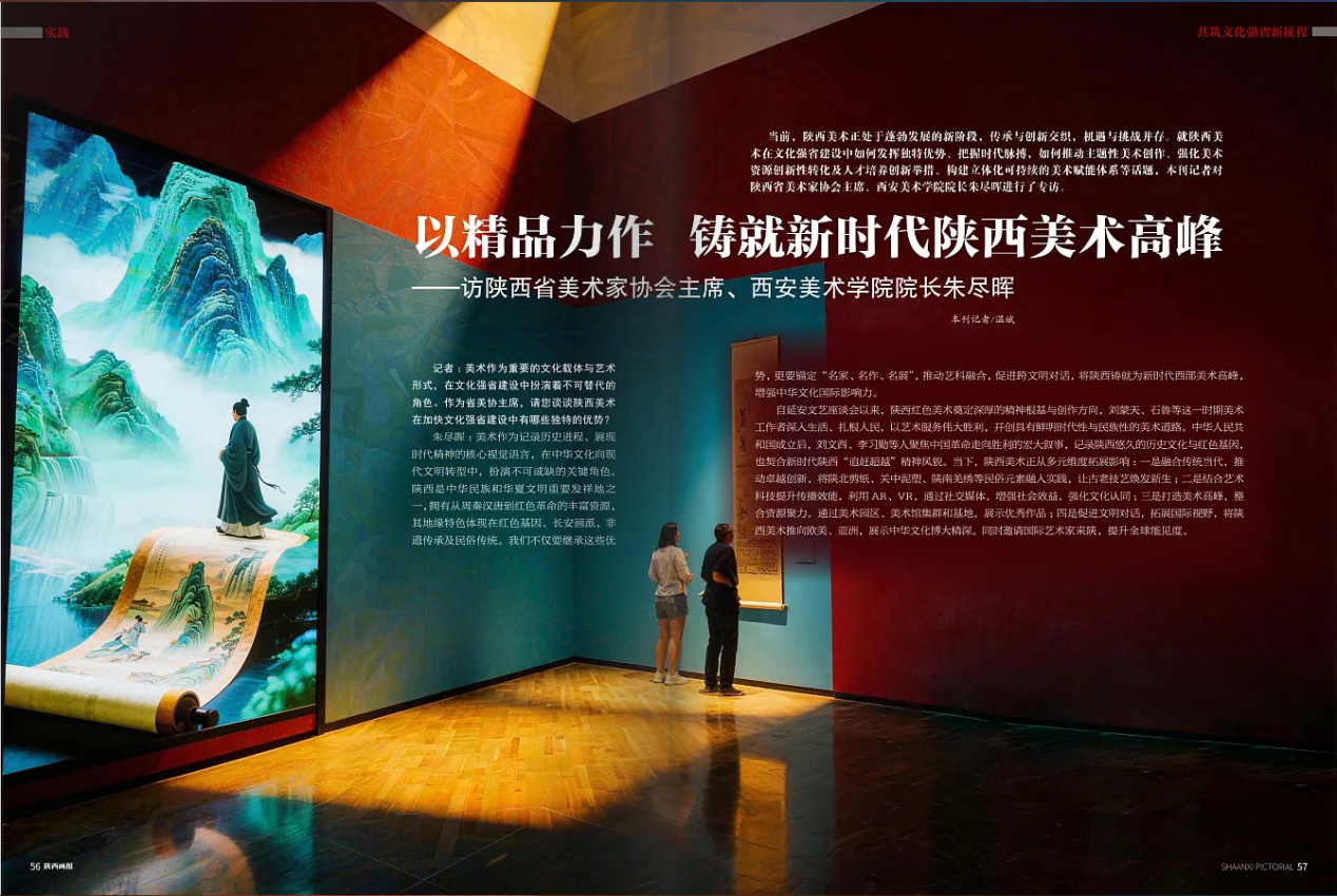 编者按:近日,《陕西画报》2025年第12期以《以精品力作铸就新时代陕西美术高峰》为题,深度专访陕西省美术家协会主席、西安美术学院院长朱尽晖。访谈立足陕西文化强省建设,深刻阐释了我校以“五名”战略为引领,以“为人民服务,为社会主义服务”为宗旨的办学理念。通过“艺科融合、产教协同、思政贯通”深化人才培养改革,以“微观—中观—宏观”三级体系全面推进美术赋能的实践路径。文章彰显了西安美院勇担时代使命,推动陕西美术从地域叙事迈向国家表达与文明对话的责任担当。现全文转载。