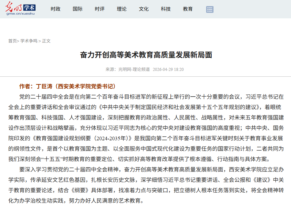 编者按:4月29日,光明网-理论频道刊发我校党委书记丁巨涛署名文章《奋力开创高等美术教育高质量发展新局面》。文章深入学习贯彻党的二十届四中全会精神,紧密结合《教育强国建设规划纲要(2024-2035 年)》部署,立足我校办学实际与红色基因、长安文脉,围绕坚持党的全面领导、立足地域文脉优势、加快数字智能化建设等方面,系统阐释新时代高等美术教育高质量发展的思路举措,为我校落实立德树人根本任务、深化内涵特色发展、服务教育强国与文化强国建设提供重要指引。现全文转载。