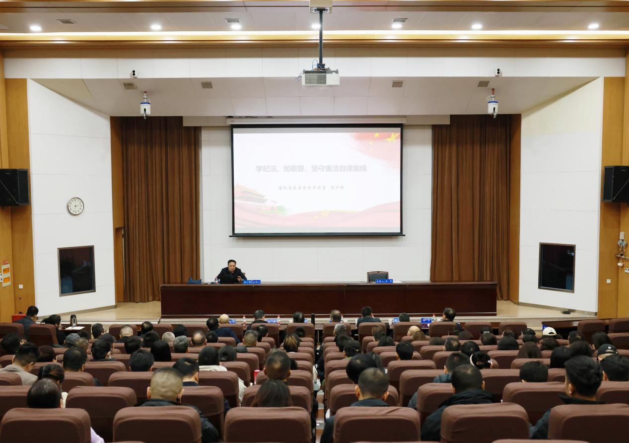 会议邀请了省纪委监委审理室副主任、三级高级监察官周少锋以“学纪法、知敬畏,坚守廉洁自律底线”为主题作专题辅导报告。报告从“四风”问题引入,深入剖析了“四风”问题到违规违纪乃至违法的演变路径,深刻揭示作风问题与违纪违法之间的内在关联。重点聚焦违规收送礼品礼金、违规吃喝、公款旅游等易发多发问题,结合具体案例深入剖析其违规违纪与违法犯罪的本质区别与转化条件,为全体参会人员厘清了纪律底线与法律红线的界限,进一步强化了党员干部的纪律意识和规矩意识。
