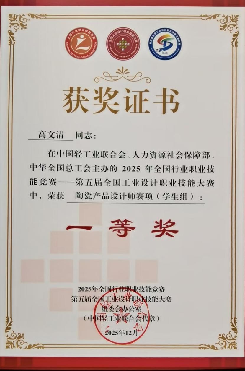 近日,在浙江宁波落幕的2025年全国行业职业技能竞赛——第五届全国工业设计职业技能大赛中,工艺美术系陶瓷艺术设计专业2024级研究生高文清凭借扎实的专业能力与突出的创新思维,在陶瓷产品设计师赛项(学生组)中脱颖而出,荣获全国一等奖,总成绩位列全国第二。