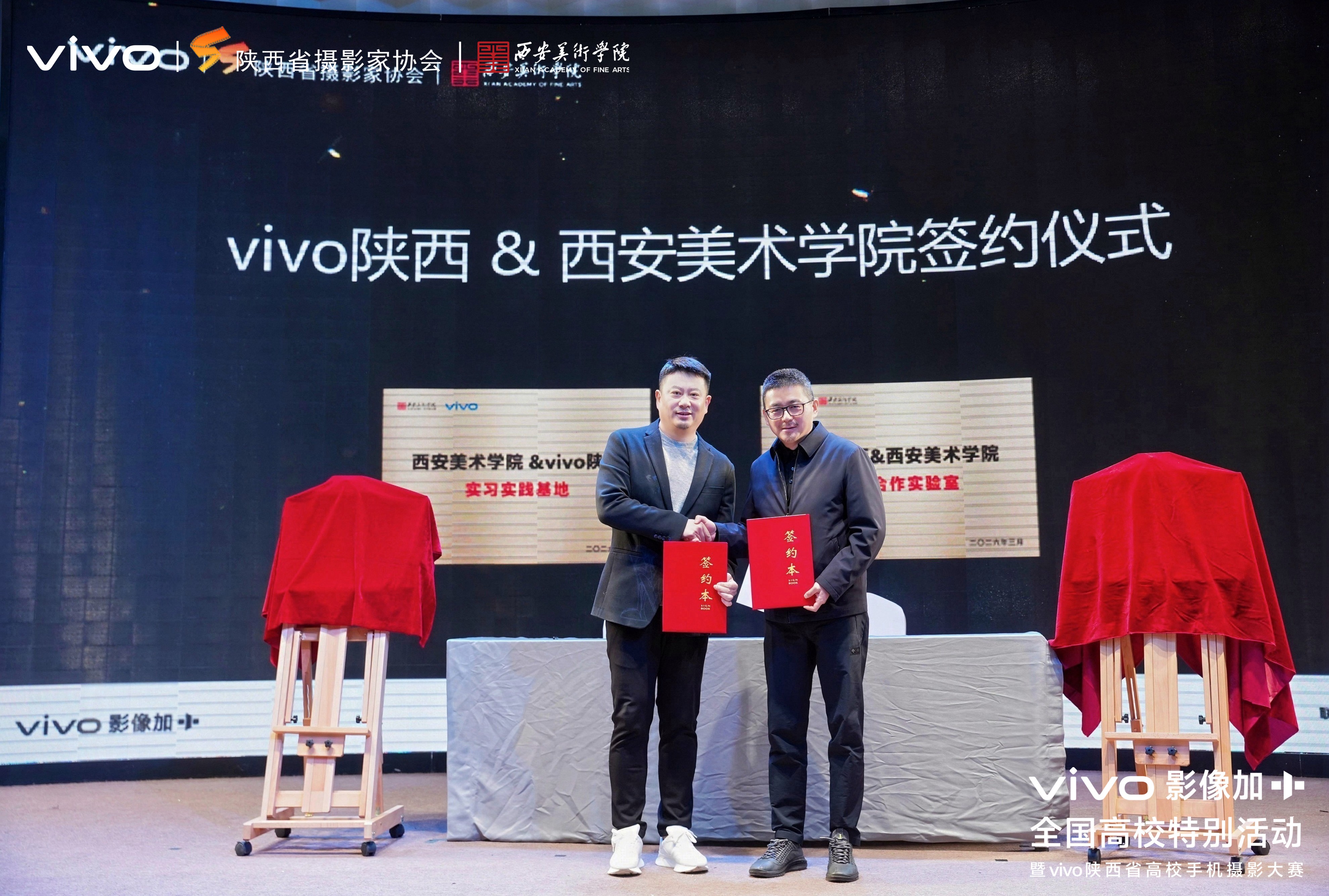 仪式上,嘉宾共同启动vivo陕西省高校手机摄影大赛,武小川与李鹏签约并授牌,标志着双方在影像人才培养、创作实践等方面的深度合作正式落地。