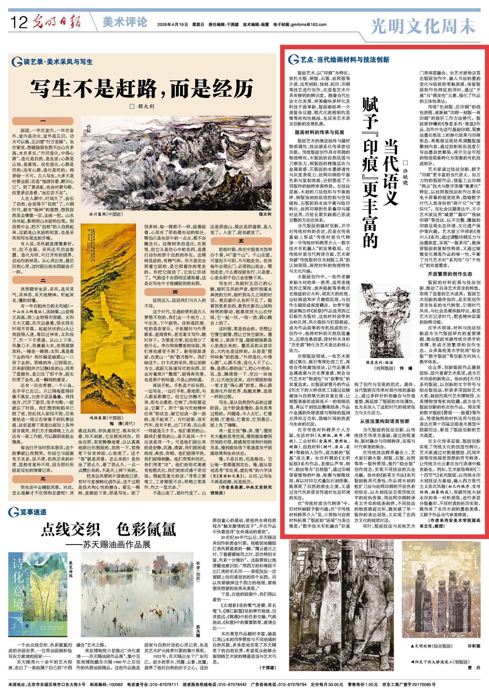 编者按:4月19日,《光明日报》刊发西安美院版画系许欲晓教授署名文章《赋予“印痕”更丰富的当代语义》,文章系统阐释当代版画在材料革新、语言拓展与创作生态等方面的多元探索。立足西安美院版画教学与创作实践,深入剖析从传统木版、铜版到数字媒介、综合材料的跨界融合路径,强调“印痕”作为版画核心语言在记录时代、回应社会议题与激活文化记忆中的独特价值。具体报道内容如下: