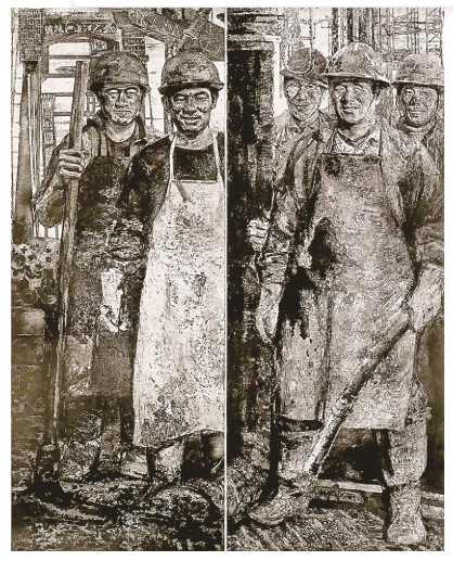 在铜版画领域,一些艺术家通过氧化、做旧等预处理工艺,再结合传统腐蚀技法,让作品兼具金属质感与历史厚重感,契合当代艺术对“物质性”与“叙事性”的双重追求。如版画家曹丹的作品《阳光下的大桥浇筑工》通过盐酸腐蚀与自然氧化的双重处理,让铜版表面形成深浅不一的铜绿肌理,再以干刻技法雕琢线条,作品中金属的冷硬质感与铜绿的温润光泽相互交织,隐喻时间的流逝与生命的沉淀。